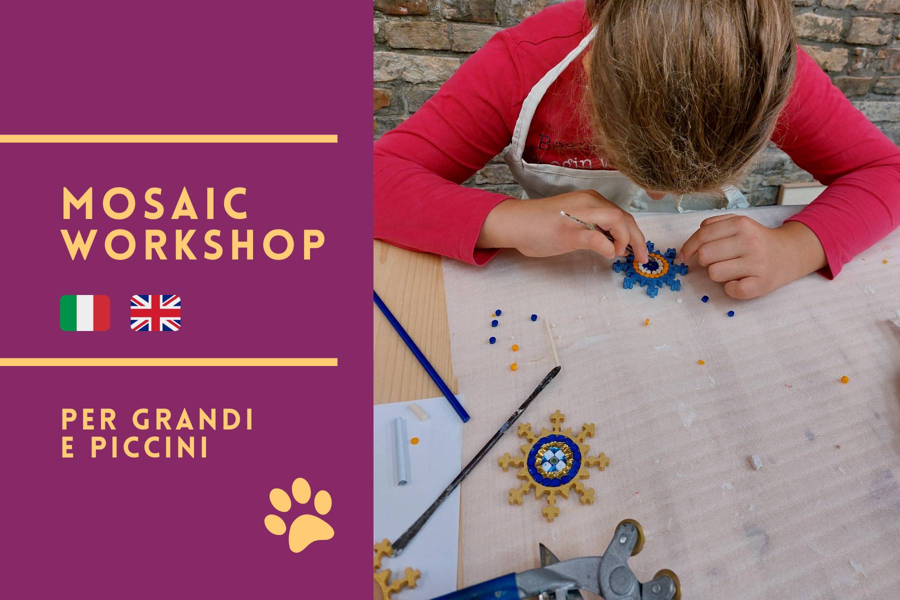 Please note that the workshop is a working artisan space where marble, glass, and smalti are used daily: there may be small fragments, loose tesserae or dust on the floor, and other participants — including children — may be present.