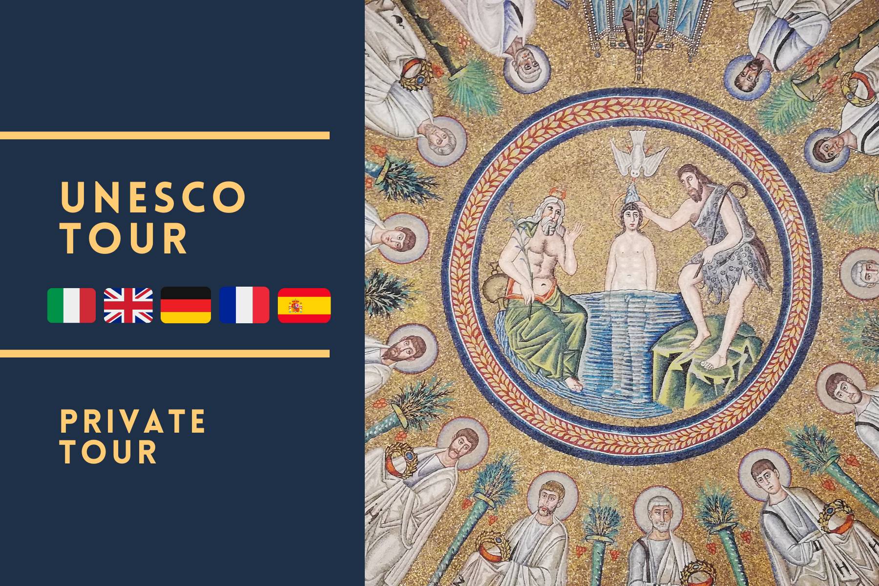 Questo viaggio nel tempo ci condurrà come prima tappa al Battistero degli Ariani, una delle più importanti testimonianze del culto ariano-ostrogoto a Ravenna (condannato successivamente a eresia), dove contempleremo la decorazione musiva della cupola, che lo rende uno dei siti Patrimonio Unesco della città. Qui inoltre, ammireremo le modifiche decorative e strutturali che il monumento ha subito nel corso dei secoli.